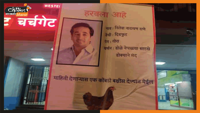 मुंबई में चर्चगेट और गिरगांव समेत कुछ इलाकों में एक बीजेपी विधायक की तस्वीर लगाई गई है, जिसमें उनके गुमशुदगी की खबर है। खास बात ये है की इस विधायक के बारे में जानकारी देने वाले को एक मुर्गी इनाम में दी जाएगी। ये विधायक और कोई नहीं बल्कि केंद्रीय मंत्री नारायण राणे (Narayan Rane) के बेटे और बीजेपी विधायक नितेश राणे (BJP MLA Nitesh Rane) हैं।