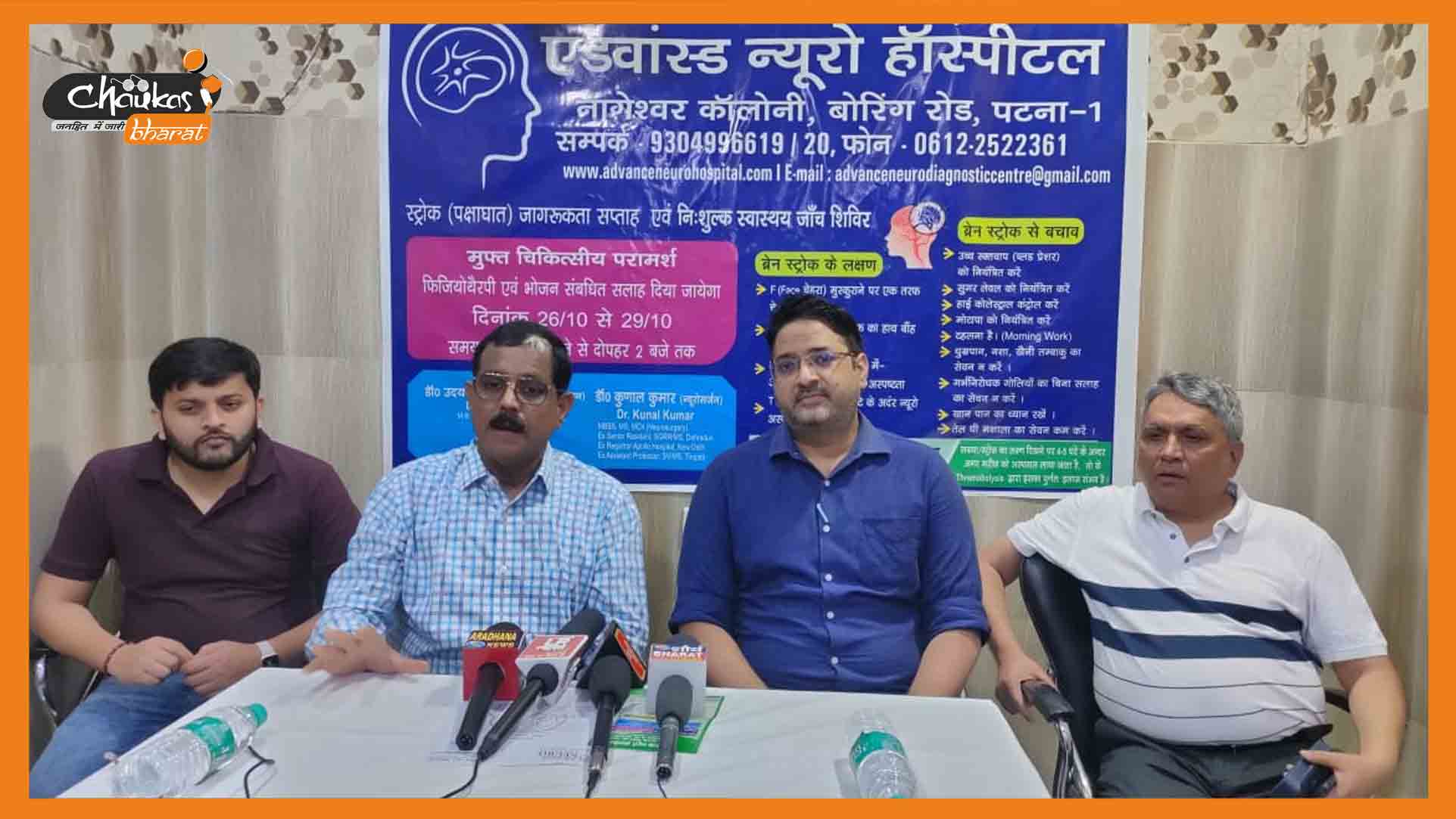 विश्व स्ट्रोक दिवस (World Stroke Day) के उपलक्ष्य में बोरिंग रोड स्थित एडवांस्ड न्यूरो हॉस्पिटल (Advanced Neuro Hospital) द्वारा स्ट्रोक जागरूकता सप्ताह एवं निःशुल्क स्वास्थ्य जांच शिविर का आयोजन पटना में किया जा रहा है। 26 अक्टूबर से 29 अक्टूबर, 2022 तक आयोजित इस शिविर में लोगों को स्ट्रोक, ब्रेन हेमरेज से संबंधित बीमारी एवं उसके बचाव के बारे में बताया जाएगा। इसके साथ ही हॉस्पिटल द्वारा जरूरतमंद लोगों का मुफ्त इलाज भी किया जाएगा।